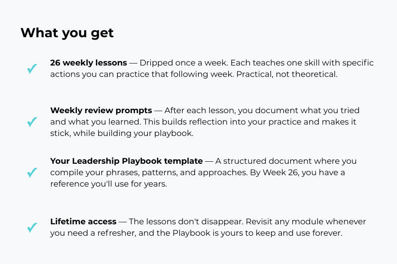 By Week 26, you'll have a personal Leadership Playbook. Phrases that work. Patterns you recognize. Approaches for specific situations. A reference you'll use for years.