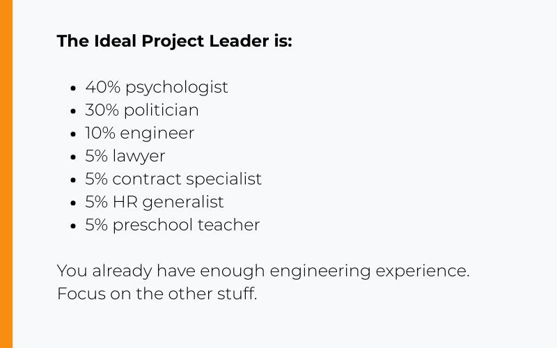 When I realized I wanted to move into project leadership, I did what engineers do. I researched MBA programs. Made financial plans. Talked to my boss about a sabbatical.I would have spent $100,000 and two years on a master's degree, if I hadn't had a chance conversation with a PM at a conference.He admitted his Masters in Project Management had been useless. Didn't teach him any of the skills he needed to lead people. Only the project management theory you can't apply in most projects anyway because you don't have the resources.That conversation saved me years and six figures.No one tells you how to move beyond being "The Engineer." Annual corporate development plans are mostly pro-forma nonsense. The advice to "just get another master's degree in project management" doesn't teach you people skills.And "just get more experience and eventually you'll be given an opportunity to lead" is toxic. It keeps engineers stuck for years.Leadership opportunities are taken, not given. You must be a leader first. The title only makes it official.